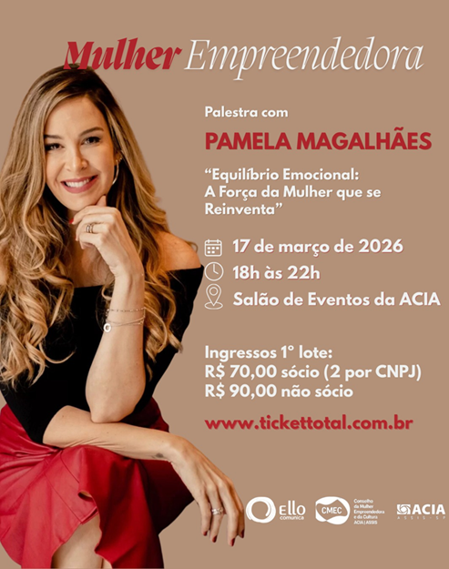 O encontro será realizado no Salão de Eventos da ACIA e contará com a participação da psicóloga e palestrante Pamela Magalhães, que abordará o tema “Equilíbrio Emocional: A Força da Mulher que se Reinventa”. Durante a apresentação, Pamela trará reflexões sobre autoconhecimento, resiliência e estratégias emocionais que ajudam mulheres a enfrentar desafios e transformar suas jornadas pessoais e profissionais.